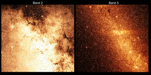 Two overlapping 3.5 x 3.5 deg spectral images of the Galactic plane taken in band 2 and band 5. In band 2 (covering wavelengths 1.1 – 1.6 um) we see significant obscuration by intervening dust. The longer wavelengths in band 5 (covering wavelengths 3.8 – 4.4 um) see through most of the dust, revealing the hidden stellar bulge. Some denser interstellar dust clouds are still apparent near the top of the image. The bar visible in the middle of band 5 is caused by line emission from Bracket Alpha at 4.05 um.