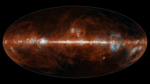 This all-sky mosaic image from NASAs SPHEREx space telescope was collected between May and December 2025 and features two of the 102 infrared colors the observatory can detect. Infrared colors are invisible to the human eye but are represented here in visible colors. The infrared colors included in these images were selected to highlight the presence of hot hydrogen gas (blue), and cosmic dust (red). The bright feature running through the middle of the images is the Milky Way Galaxy, filled with gas and dust.